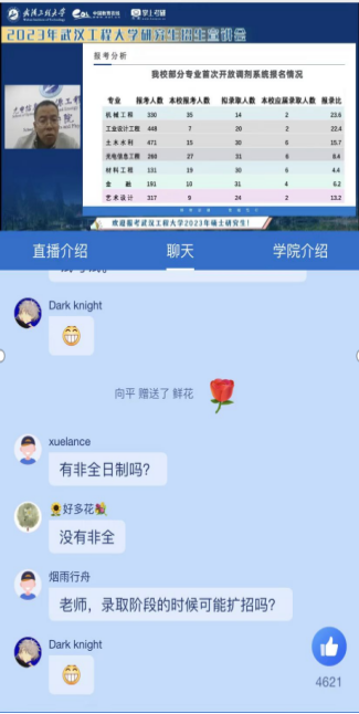 2023年全国硕士研究生招生政策与往年相比有一定的变化,报考条件有所调整,所以本次直播时常持续2小时,总共吸引了5000多名员工参与。线上,员工提问积极,气氛热烈,四位教授对同学提出的专业问题进行详细耐心的解答,秘书周曼曼全程在线回答员工提出的研究生日常学习生活相关问题,并鼓励大家积极报考公司。这是公司第二次进行网上研究生招生宣传活动,切实为考生答疑解惑。本次活动既拉进了与考生的距离,也助推公司研究生招生工作的建设。