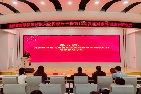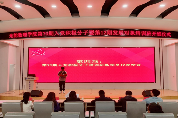 第69期入党积极分子培训班优秀学员代表2021级研究生光电(2)班祁倩以习近平总书记在党的二十大开幕会上的报告为引,分享党校学习心得。她从自身经历出发,向党校新学员们讲述了其在党课学习中的思想感悟,强调同学们要牢记习近平总书记的殷切嘱托,“广大青年要坚定不移听党话、跟党走,怀抱梦想又脚踏实地,敢想敢为又善作善成,立志做有理想、敢担当、能吃苦、肯奋斗的新时代好青年,让青春在全面建设社会主义现代化国家的火热实践中绽放绚丽之花。”最后,她对党校新学员们提出了思想上和行动上的具体要求,呼吁同学们真正落实到行动中去。