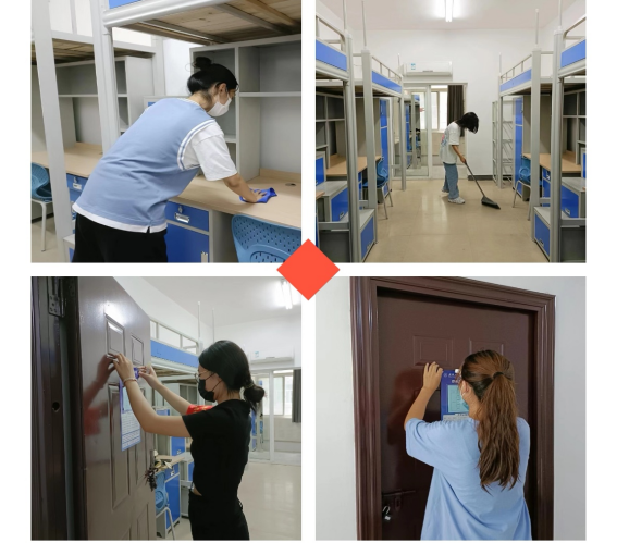 员工党员们分头行动,深入新生寝室进行卫生清扫,排查安全隐患并张贴寝室信息牌。