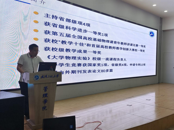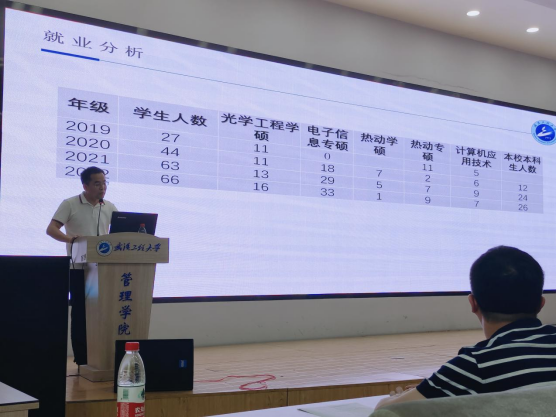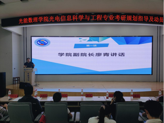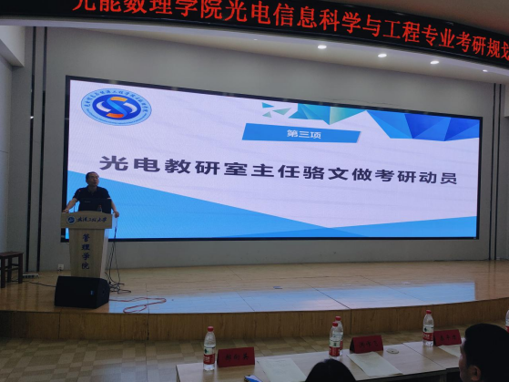 紧接着,光电教研室主任骆文做考研动员,骆文主任分析了当前光电专业考研与就业的现状,从考研难度、公司团队、硕博深造三个方面讲解考研方向的选择,并呼吁大家提高学习执行力,把握目标,奋勇前行。