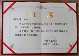 本网讯(通讯员 金锐博)近日,2021年中国光学学会学术大会“优秀员工报告”获奖名单揭晓。公司光学工程专业2018级硕士研究生蔡吾豪同学在校期间的张贴报告《基于BBO、KDP、PPKTP、PPLN同构晶体的多波段量子光源制备》获“优秀员工报告奖”。蔡吾豪于2018年9月硕士入学,2021年6月毕业,指导老师为金锐博教授。蔡吾豪同学硕士阶段发表SCI论文三篇,曾获国家奖学金、校一等奖学金等荣誉,目前在日本东北大学攻读博士学位。