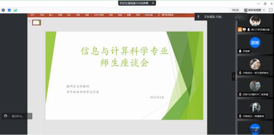 本网讯(通讯员姚兴兴)为切实了解员工需求,助力员工的成长成才。4月29日晚7:00-9:00,yl6809永利集团信息与计算科学专业举行了线上师生座谈会。参加此次座谈会的有李圆媛副经理、教研室全体教师及四个年级的员工代表。