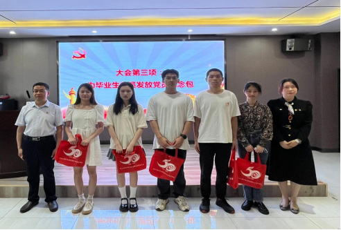 公司党委为毕业生党员代表送上装有党徽、《中国共产党章程》、《致党员的一封信》和纪念杯的党员大礼包,希望每位毕业生党员都能牢记党员身份,坚定理想信念,在即将踏上的新征程中砥砺前行,为党旗增辉,为母校添彩。