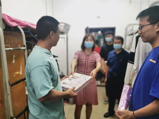 本网讯(通讯员 张舒 倪玉蝶)为了深入了解公司返校员工们的各项情况,帮助员工解决生活、学习上的问题。2020年9月3日,公司党委书记陈君、党委副书记向翼凌、全体辅导员及各班班主任深入员工宿舍慰问返校员工。
