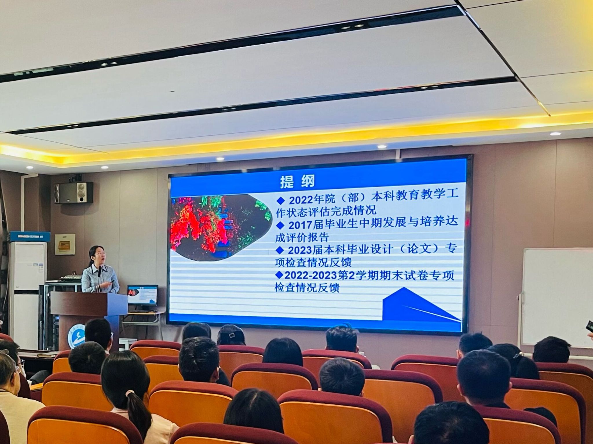 副经理李圆媛就本科教学工作情况进行了汇报。她首先就公司在2022年院(部)本科公司产品工作状态评估完成情况中各项指标情况进行了解说;接着就《2017届毕业生中期发展与培养达成评价报告》中得分偏低的指标进行了反思并提出了相关建议;随后将校督导组对2023届本科毕业设计(论文)专项检查情况进行了反馈,对存在的问题进行了分析,并提出改进对策;最后针对校督导组在2022-2023第2学期期末试卷专项情况中发现的问题进行了说明,并提出了具体整改措施。